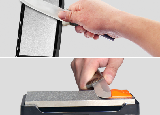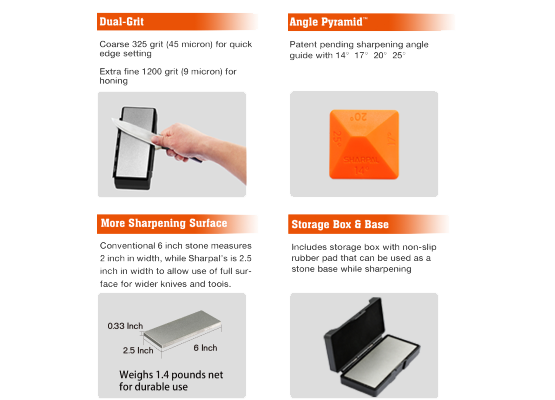 SHARPAL 162N Dual-Grit Diamond Whetstone that measures L 8 inch x W 3 inch is capable of handling a wide variety of edges including kitchen and pocket knives with either a single or double bevel on the blade, tools and much more. With MirrorFlat™ technology, hard wearing surface and durable design, it guarantees consistent, even sharpening for years of dependable use. It is double-sided with both coarse and extra fine diamond surfaces. Use the coarse diamond stone 325 grit (45 micron) to quickly and easily restore a dull or damaged edge. Use the extra fine diamond stone 1200 grit (12 micron) to hone. Sharpen dry. No messy oil needed. It comes with a high-impact plastic self-storing case with non-slip rubber pad that can be used as a stone base while sharpening. More value-added gadget is the patent pending Angle Pyramid™ Sharpening Angle Guide integrated with 4 angles-14°, 17°, 20°, 25° for choice for almost all kinds of knives.
